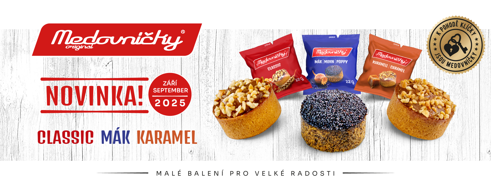 Medovník originál přichází s novinkou – Medovníčky, malé křehké košíčky z medovníkového těsta s jemným krémem a křupavým posypem. Po šesti letech vývoje se na trh dostávají ve třech příchutích – Classic, karamel a mák.